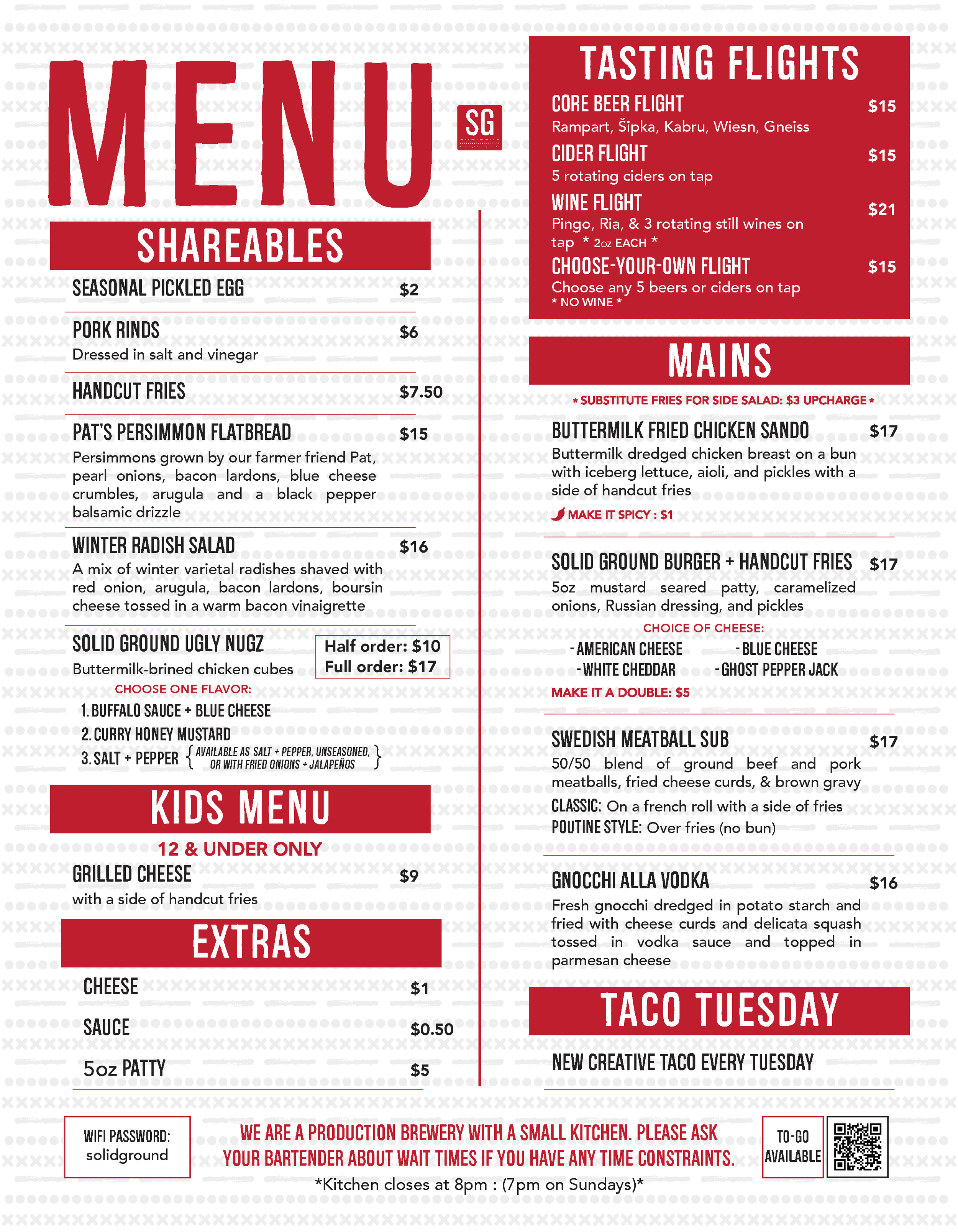 Details AVAILABLE CANS & BOTTLES RAMPART: American Helles Lager 16oz 4-packs Rampart Lime: American Helles Lager with Lime 16oz 4-packs Darvaza: DIPA with Sipka: Czech Style Pilsner 16oz 4-packs Strobulis: Hazy IPA 16oz 4-packs WIESN: Hefeweizen 16oz 4-packs KABRU: West Coast IPA 16oz 4-packs Blackberry: Cider 16oz 4-packs Gravenstein: Cider 16oz 4-packs PINGO: Sparkling Pinot Grigio Single 355mL Can PINGO: Sparkling Pinot Grigio 355mL 4-packs RIA: Sparkling Pinot Noir Rosé Single 355mL Can RIA: Sparkling Pinot Noir Rosé 355mL 4-packs FOOD MENU
